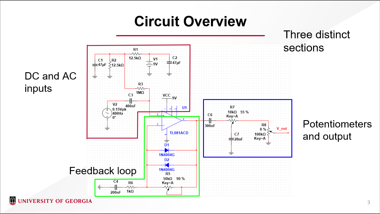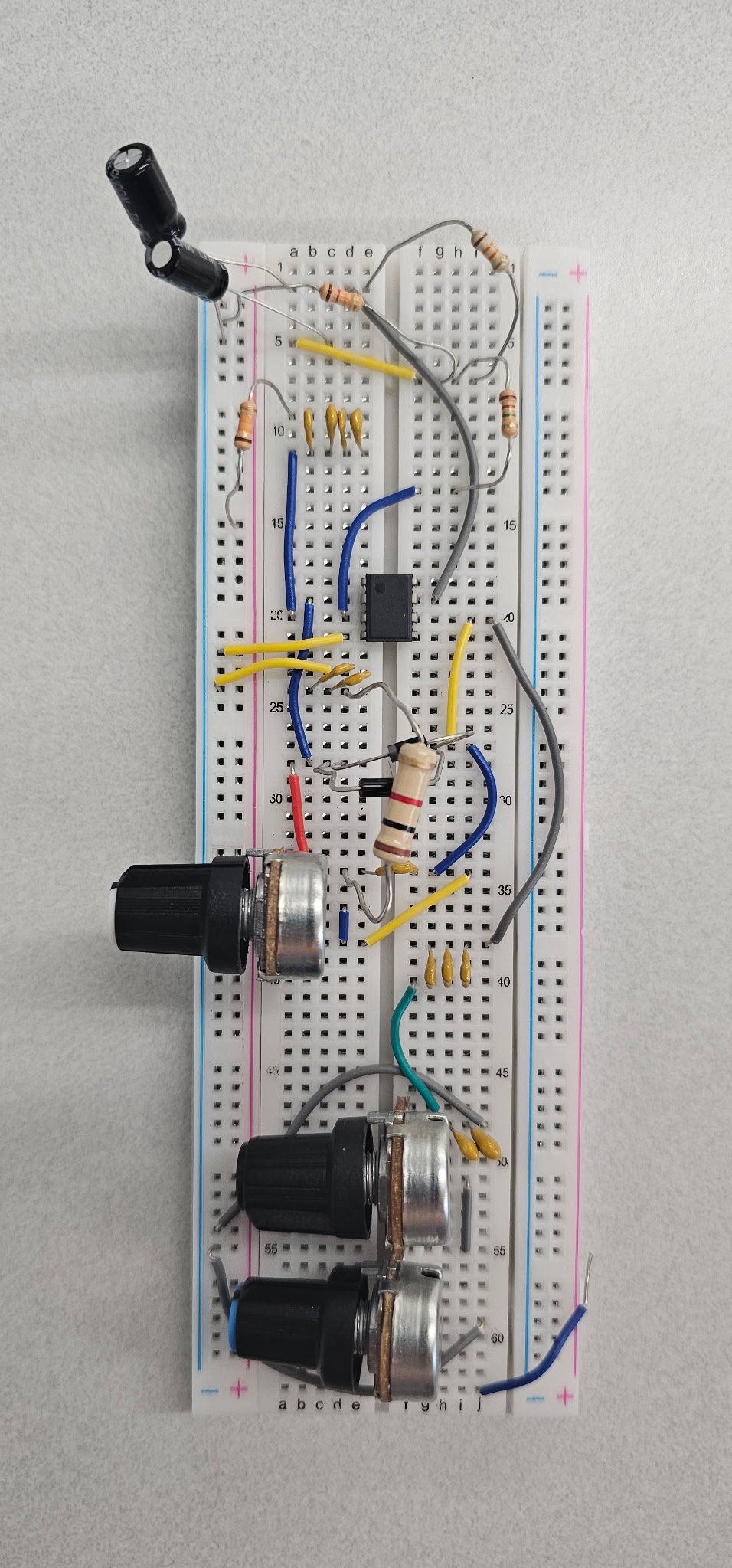 All that was left to do was construct the circuit and test it. We ordered all the parts we needed and constructed it on a breadboard. During testing, we found that the circuit worked as expected, but there were a few small issues with it. One was that there was some residual noise created at the output. This was not too bad, but if we were to iterate on the design, we would likely include some anti-noise measures. Another issue we found was that the low pass filter in the output portion of the circuit was not extremely significant. You can see this fact on slide 11 of the presentation. There was some difference between the output signals when the potentiometer on the filter was adjusted, but not as much as we would have hoped for. If we iterated on the design, we would likely include a different adjustable low pass filter to increase the effectiveness of the tone adjustment.